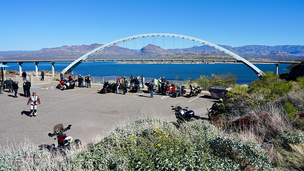 The ride started at GO AZ Motorcycles in Scottsdale, which as always, showed massive support for the Club. I led the rider’s meeting, and it was great to see all the eager faces ready to brave a somewhat chilly morning. With 20 plus bikes in attendance, I led the way out of the dealership around 9:45 am. Rodney and Stoops ran ahead of the group to set up some drone shots at the dam, and Dean, on his glorious Gold Wing, was the ride sweep. We didn’t know it then, but that Gold Wing, with its extremely comfortable passenger seat, would star later in the ride.